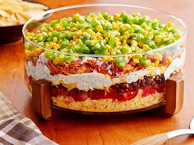 Chop tomatoes and spring onions. Add mint and chili pepper to the yogurt and mix them together. Roll 2 of the baked tortillas through the rondo. Layer the tortilla at the bottom of your serving bowl, and then layer it with tomatoes, Mexican beans, cheddar cheese, yogurt, corn and spring onions. Repeat this process until all the ingredients are used up. Use the remaining tortillas for serving.